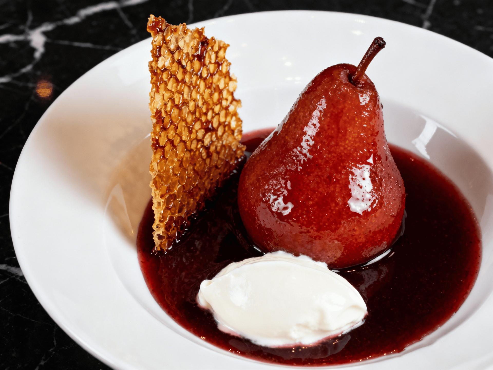 紅酒燉梨配希臘乳酪及蜜糖脆片